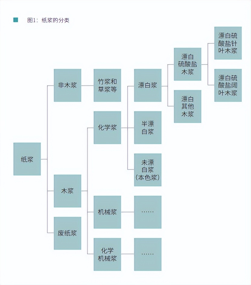 目前,漂白硫酸盐针叶木浆(以下简称漂针浆)和漂白硫酸盐阔叶木浆(以 下简称漂阔浆)是市场上主流的两种木浆。纸浆具体分类如图1所示。