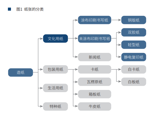 目前我国所能生产的纸张品种非常丰富多样,总数达到数百种,几乎涵盖了所有的纸张类型。根据用途分类,主要可分为文化用纸、包装用纸、生活用纸、特种纸等四大类。文化用纸作为信息传递、知识传播和文化传承的重要载体,主要用于印刷和书写,可以分为未涂布印刷书写纸(包括胶版印刷纸、静电复印纸、书写纸等)、涂布印刷书写纸(包括铜版纸等)和新闻纸(见图1)。胶版印刷纸是文化印刷用纸的典型代表纸种,主要以漂白木浆为原料制成。主流图书均采用胶版印刷纸进行印刷,目前,市面上绝大多数的胶版印刷纸均为双面胶版印刷纸(以下简称双胶纸),行业通常以“双胶纸”代指。根据中国造纸协会统计,双胶纸作为未涂布印刷书写纸种最主要的分类,约占其国内消费量的半数以上,约占国内文化用纸消费量的40%。品种类型方面,市面上主要根据双胶纸定量(俗称克重)、亮度等质量指标进行区分。市场上最主流、最常见的双胶纸定量在60-90g/m2之间,大多数图书、期刊和商务办公用纸均在此定量范围内;定量在25-40g/m2的双胶纸通常称为轻量纸(或轻型纸),主要用于印制词典等;定量在140g/m2及以上的双胶纸通常称为高克重双胶纸,具有表面平滑度高,耐折度好等特点,主要应用于制作宣传广告海报、高档产品目录、会议请柬、生日贺卡等。市场上还会根据纸张亮度进行划分,分为高白、本白、米白等。一般来看,高白双胶纸的D65亮度在95%以上,本白双胶纸的D65亮度在80%-85%,米白双胶纸的D65亮度在80%以下。