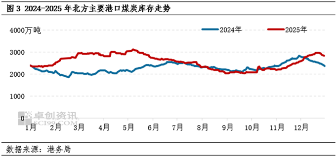 另就港口库存来看,北方港口煤炭库存持续保持高位有增趋势,回升至去年同期水平之上后继续增加,至下旬后半段止增去库。截至12月30日秦皇岛港、曹妃甸港及京唐港合计煤炭库存在2835万吨,较上月底增加309万吨,增幅在12.23%;较去年同期增加452.3万吨,增幅在18.98%;月内库存最高点达到2975万吨,较年内库存最低点累计增加46.19%,较年内库存最高点略低4.31%。12月中上旬铁路发运量整体保持在相对高位水平,同时下游需求偏弱,且时有不利天气等封航制约港口资源调出,带动港口煤炭库存快速攀升,对市场情绪造成严重打击;至下旬后半段随产地供应收缩,资源调入量下滑,且月底调出略有恢复,港口煤炭库存止增转降。