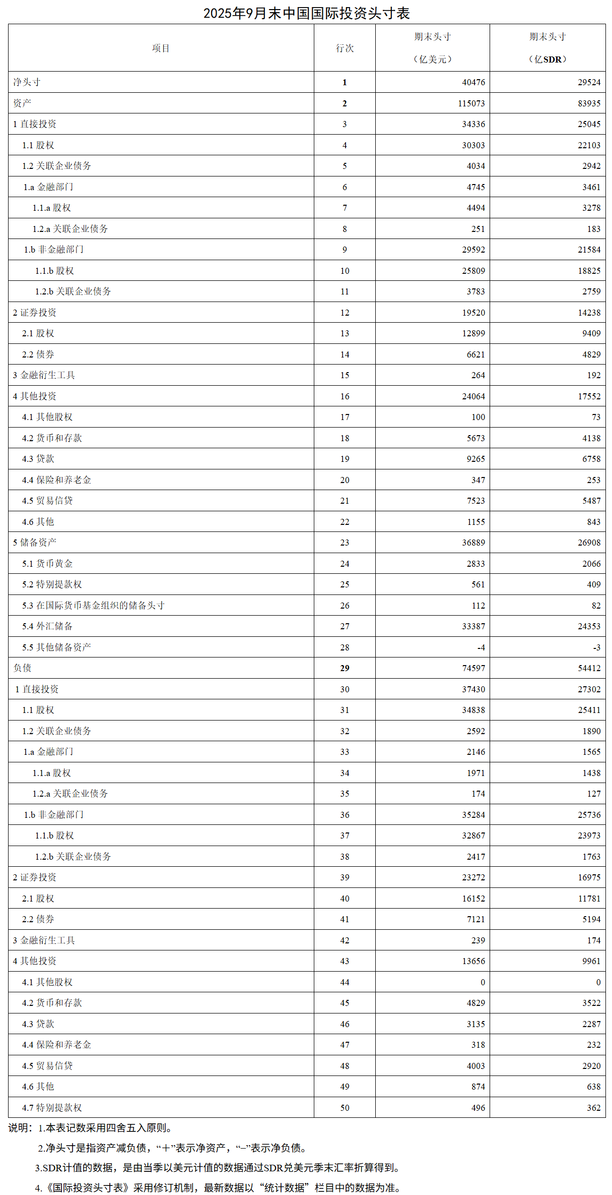 按SDR计值,2025年9月末,我国对外金融资产83935亿SDR,对外负债54412亿SDR,对外净资产29524亿SDR。