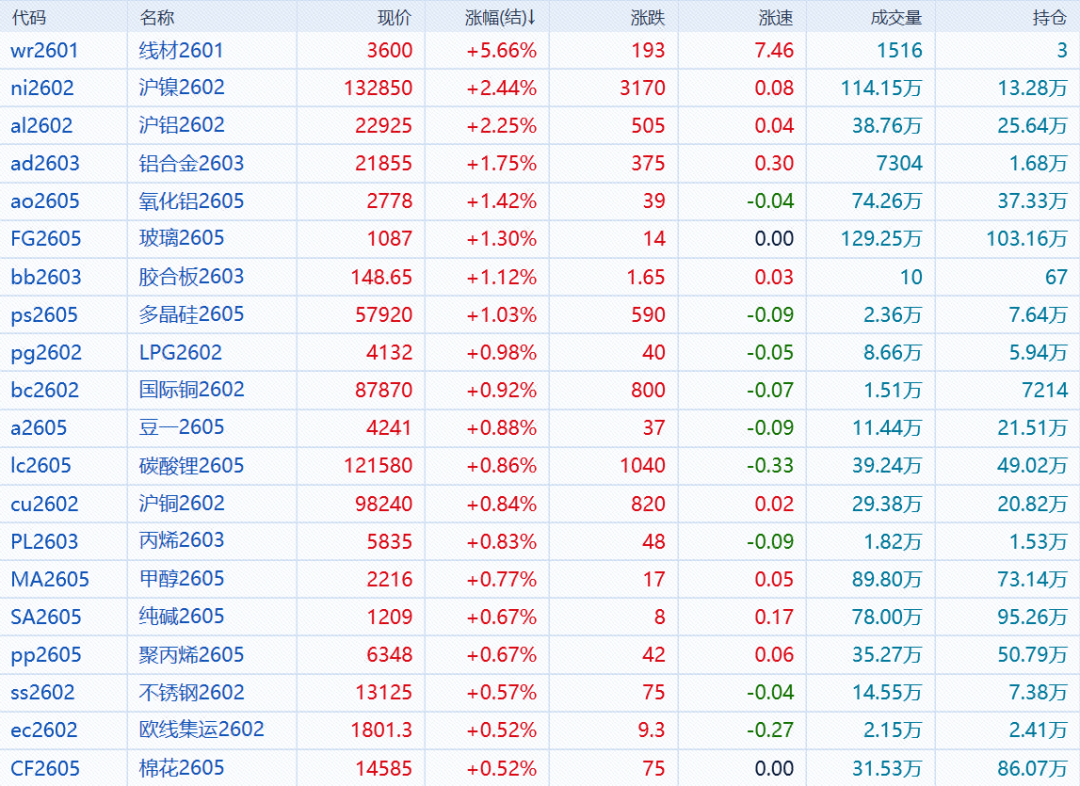 12月31日,午市收盘,国内期货主力合约涨跌不一。沪镍、沪铝涨超2%,氧化铝、铝合金、玻璃、多晶硅涨超1%。跌幅方面,铂跌超12%,钯跌超5%,沪银跌超4%,低硫燃料油(LU)跌超2%,燃料油、焦炭、SC原油、硅铁跌超1%。
