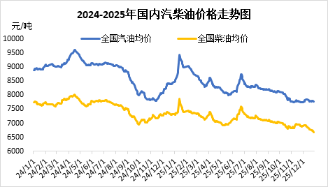 消息面及传统需求面双重承压,共同压制市场价格。虽然受港口制裁及炼厂检修影响,四季度主营炼厂及地方炼厂开工率继续回落,成品油资源供应相应减少,曾一度支撑国内汽柴油批发行情趋于坚挺。柴油方面,11月份受北方地区置换负号柴油、以及主营单位资源配置等因素影响,局部地区资源紧张,价格出现阶段性反弹。然而,随着柴油逐步进入冬季消费淡季,而汽油缺乏长假支撑、需求表现亦平淡,叠加新能源车对燃油需求的渐进式替代影响持续渗透,市场基本面未能获得实质性利好提振,国内汽柴油行情再度转为下行趋势。