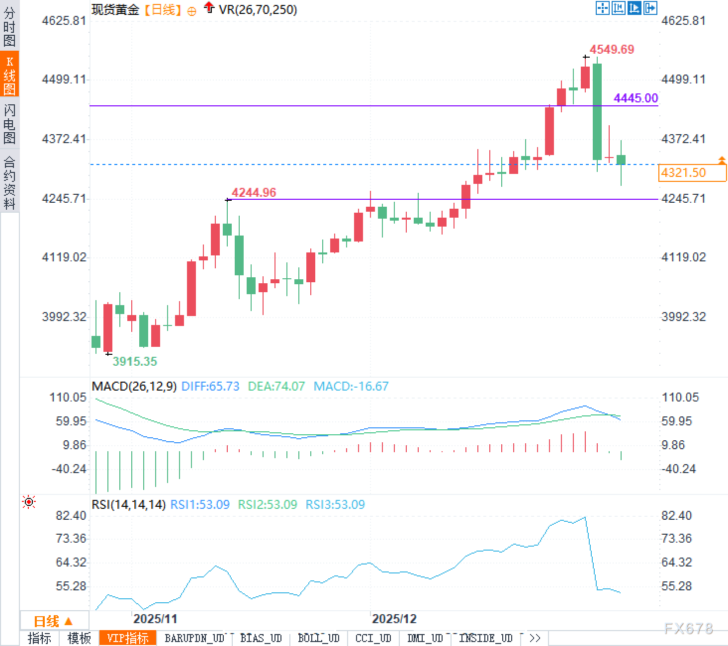 现货黄金日线在前期上行后出现明显回吐,最高一度上探至4549.69美元附近,随后出现一根幅度较大的回落K线,显示高位抛压释放得较为集中。当前价格处于回撤后的整理区间,市场正在重新寻找多空平衡点。从图形上看,4445.00美元一带更像前期的关键分水岭:上行阶段它提供了支撑与突破动能,而在回撤后容易转化为上方需要重新消化的压力带;下方则可留意4245美元附近的区域,它对应前期整理平台与多次成交密集带,往往是资金是否愿意重新承接的观察位。