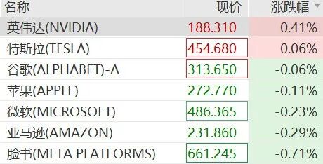科技股表现不佳,截至22:50,美国科技七巨头多数下跌,英伟达高开后涨幅缩小。