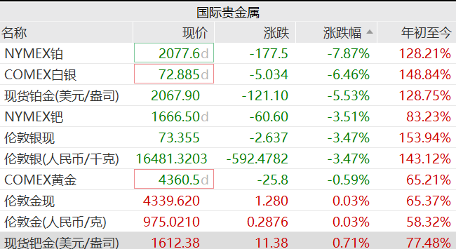 现货白银、钯金一度跌超7%,目前白银期货扔跌超6%;