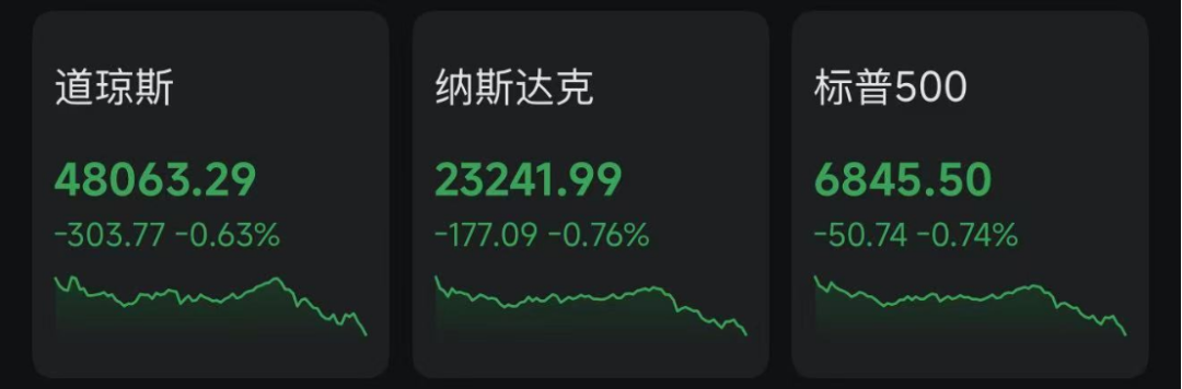 当地时间12月31日,美股三大指数集体收跌。截至收盘,道指跌303.77点,跌幅0.63%,报48063.29点;纳指跌177.09点,跌幅0.76%,报23241.99点;标普500指数跌50.74点,跌幅0.74%,报6845.50点。