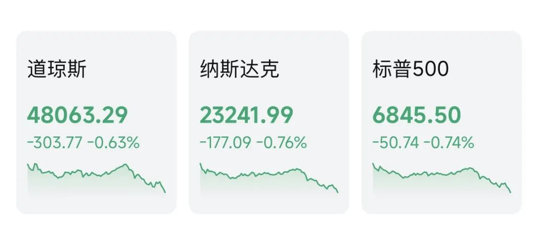 截至收盘,道指跌0.63%,报48063.29点;标普500指数跌0.74%,报6845.5点;纳指跌0.76%,报23241.99点,均录得四连跌。拉长时间来看,2025年全年,道指涨12.97%,标普500指数涨16.39%,纳指涨20.36%,均录得年线三连涨。