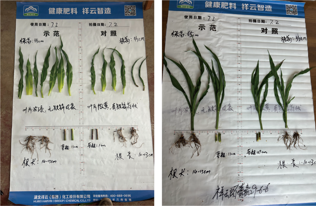 玉米苗期对养分敏感,同时也是构建健壮植株的关键阶段。祥云至胜玉米肥的高氮配比与生物膜水凝胶的保水保肥作用相得益彰,促进玉米根系生长,高效吸收土壤中的养分和水分。锌元素有效预防叶片黄化等问题,让玉米苗齐苗壮、叶片浓绿肥厚,杜绝弱苗、小苗问题。在山东菏泽定陶县30亩示范田里,使用祥云至胜的玉米苗期整体长势明显优于对照田,示范田苗更齐,株高、根长均优于对照田,且无任何缺锌症状。