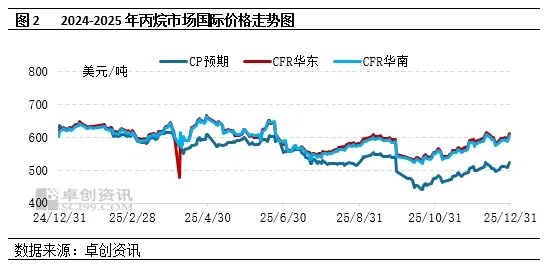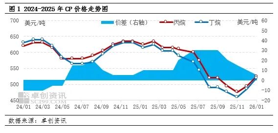 从长线趋势来看,从2025年10月下旬开始国际LPG市场触底反弹,截至12月31日,CFR华东613美元/吨,较10月下旬上涨87美元/吨,涨幅16.47%。前期主要是受中美贸易冲突影响,业者对市场信心不足,市场商谈相对冷清,导致成交重心连续下移。但在10月下旬开始,中美经过多轮商谈后达成关税延期协议,国际争端对国际价格的影响减弱。市场影响因素更多的回归到供需基本面。