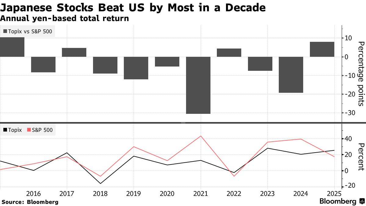 得益于强劲的企业盈利和高市早苗政府支持增长的政策立场,东证指数在2025年上涨了25%(以日元计算),创下2015年以来跑赢标普500指数的最大幅度。