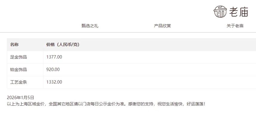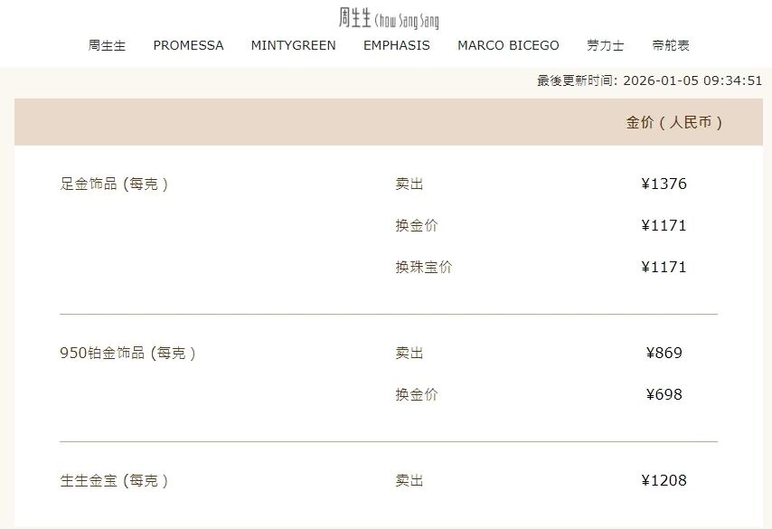 同日,周大福足金饰品最新价格报1378元/克,老庙报1377元/克,周生生报1376元/克,老凤祥报1370元/克。