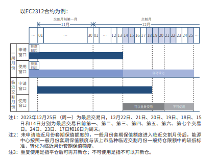 集运指数(欧线)期货合约临近月份套期保值额度的申请应当在该合约交割 月份前第一月的第一个交易日至最后交易日前第五个交易日之间提出,逾期能源 中心不再受理。