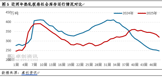 说到贸易不得不得2025年社会库存的变化,社会库存具有较强的季节性规律,一般情况下,春节前库存逐步累积,到春节后归市库存达到峰值水平,随后逐步消耗,下半年国庆节则成为库存波动的分水岭,国庆节期间库存累积,节后库存达到下半年高点,随后逐步下滑。2025年1-9月库存变化基本遵循季节性运行规律,但到国庆节归市后,库存水平继续走高,市场整体消耗进度缓慢,12月社会库存去库进程仍旧偏缓,从而带动社会库存同比变化由负转正。热轧板卷最新一期库存水平来看,截至12月18日,热轧板卷社会库存为321.07万吨,同比增加29.77%,库存偏高首先对当前市场运行形成较大压力,另外,也凸显出年底市场需求表现较为一般,对于市场库存消耗能力有限。而偏高的社会库存在经历春节累库后,也将对2026年春节后行情形成较大供应压力。