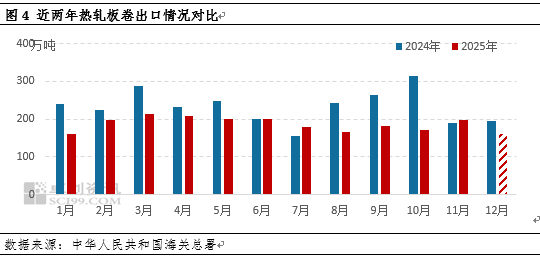 热轧板卷需求可以分为外需与内需两部分。外需来看,2025年多个贸易伙伴越南、土耳其、印度、韩国等国家对中国热轧板卷出口产品实施反倾销调查,阻碍热轧板卷出口,且随着特朗普2.0时代来临,各国之间贸易壁垒逐步提升,带动中国热轧板卷出口出现显著下滑。由图4可以看出,2025年热轧板卷月度出口水平,仅有7月、11月同比呈现增势,其余月份出口同比均出现不同幅度下滑,全年来看,预计热轧板卷出口量在2233.2万吨,同比下滑20.05%。出口量的下滑加剧国内市场竞争水平,成为带动市价下跌的重要原因。