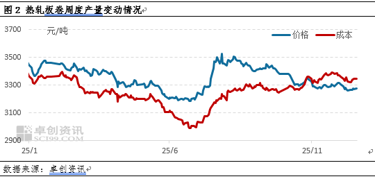 2025年上半年,在原材料焦炭与铁矿石震荡下滑背景下,热轧板卷成本线逐步下移,带动热轧板卷价格维持震荡下滑走势,但价格跌势小于成本跌势,从而带动生产企业保持一定盈利,下半年开始,成本与热轧板卷价格均出现上行,但成本涨势相对平缓,热轧板卷价格则呈现先涨后跌的局面,带动热轧板卷利润空间先扩大,后收窄,到10月份,热轧板卷价格进一步下滑,成本则继续上行,生产企业逐步出现亏损,但就全年来看,企业多数时间处于盈利状态,具体数据来看,2025年热轧板卷平均利润在39.28元/吨,同比去年同期水平提高269.43%。