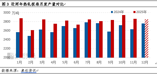 热轧板卷生产利润好转,且相关产品螺纹钢需求遇冷,带动企业保持较高的热轧板卷生产热情,近两年月度产量对比来看,2025年月度产量同比均处于升势状态,且10月产量达到2943.62万吨,刷新2025年1月创下的历史高点2876.49万吨。预计2025年热轧板卷总产量将达到33798.35万吨,同比增加6.12%。2025年产量偏高,奠定市场高供应压力的运行背景。