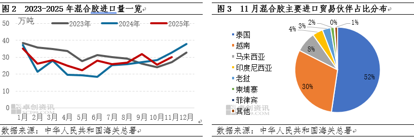 11月混合胶进口量30.22万吨,环比增长17.83%,主要自泰国进口量环比增长明显支撑,11月中国自泰国进口混合胶16.23万吨,占比高达52%,部分10月到船期推迟至11月到港,支撑进口量增长。11月混合胶进口同比减少7.88%,主要是自越南、缅甸进口量减少影响,11月自越南进口9.37万吨,环比微增1.99%,同比下滑25.23%,越南产区仍受雨水扰动,同时进口利润空间有限,导致进口量下滑;进口缅甸混合胶同比下滑,主要是因为今年以来自缅甸进口天然橡胶执行零关税政策后,缅甸进口胶不必要必须通过混合胶税则号进入国内市场流通。