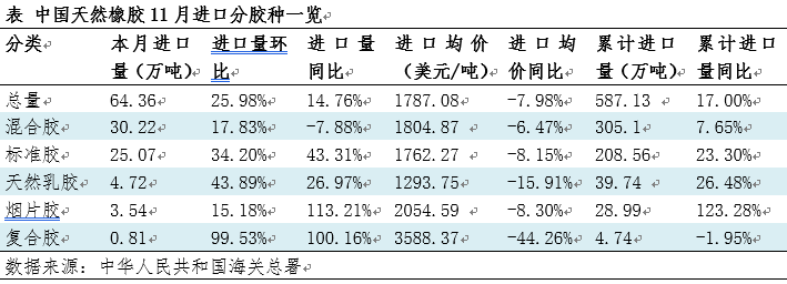 天然橡胶月度进口量:11月天然橡胶进口量同环比增长明显
