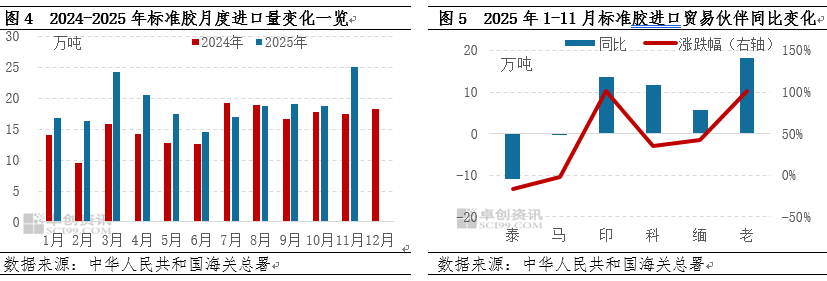2.211月标准胶进口量25.07万吨,环比增长34.2%,同比增长43.31%