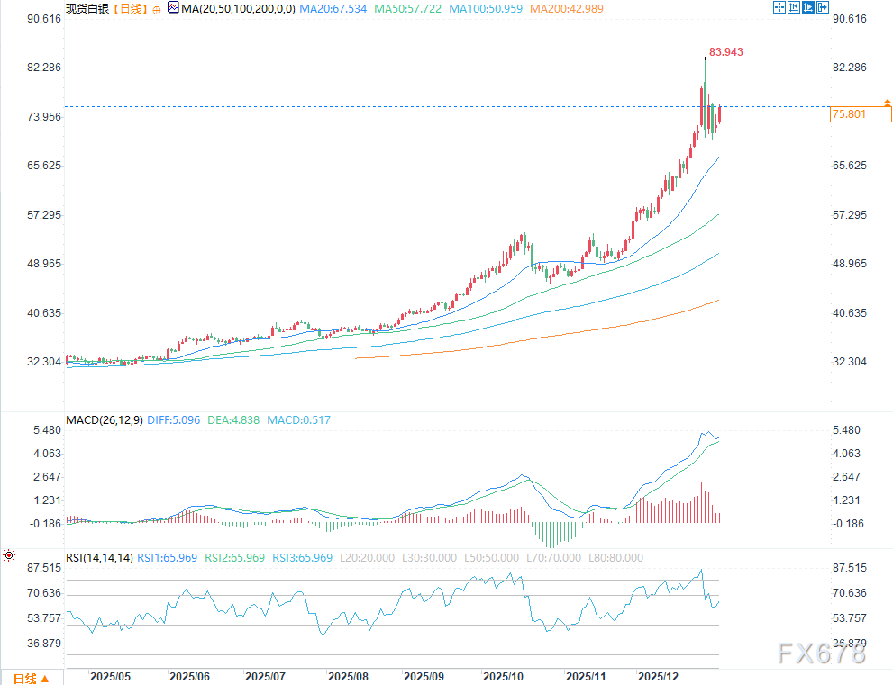 从技术角度看,2025年白银拉升过于陡峭,RSI一度超过90,显示市场处于过热状态。近期调整有助于情绪回归理性,也为下一阶段走势预留空间。