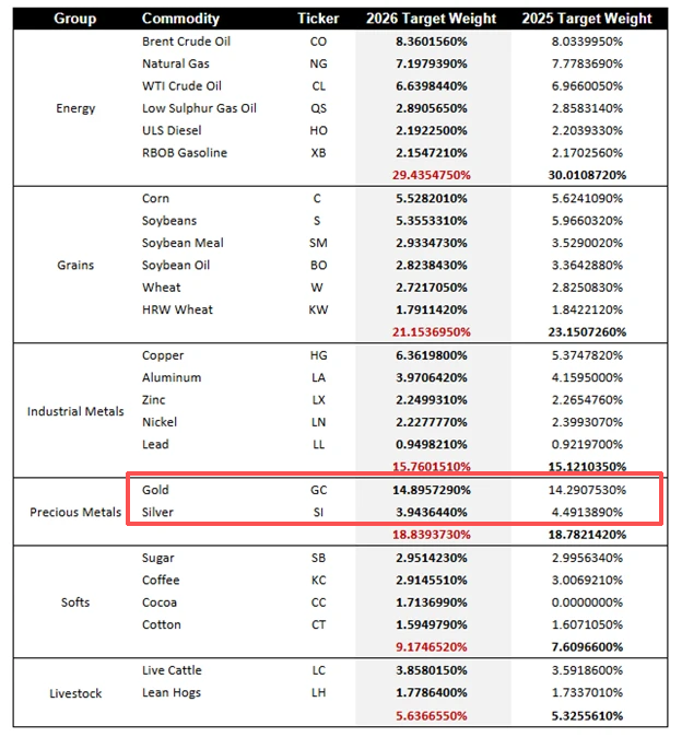 根据彭博的最新调整方案,贵金属整体目标权重比例将调整至18.84%。作为指数最大单一成分的黄金,目标权重比例从14.29%调至14.90%,白银则从4.49%降至3.94%。