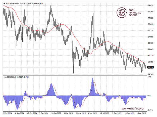 WTI原油坚挺地维持在50日均线下方,MACD底背离完好,预示着价格可能回升至58美元上方。鉴于特朗普有意恢复委内瑞拉和伊朗的石油供应,下行趋势逆转的可能性依然较低。