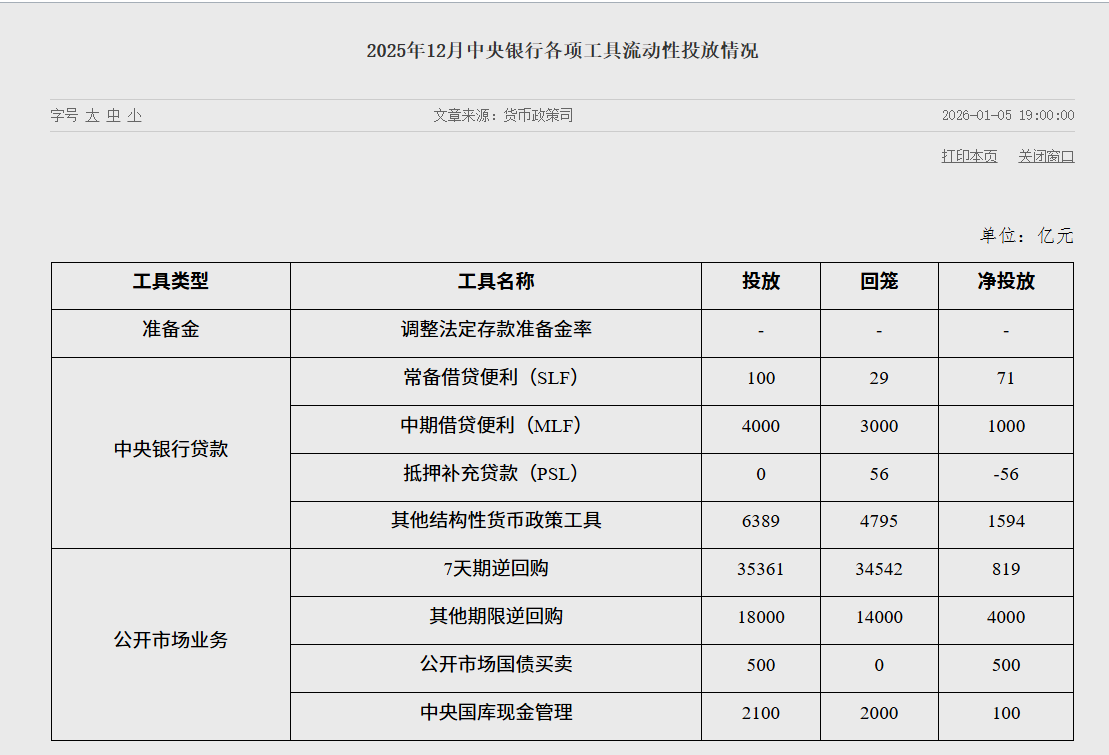 上证报中国证券网讯 1月5日消息,中国人民银行今日公布2025年12月中央银行各项工具流动性投放情况。