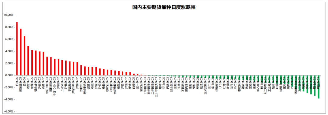 截至2026年1月5日15:00收盘,国内期货主力合约涨跌互现。其中,钯主力合约涨超8%,碳酸锂涨超7%,铂涨超6%,苹果、铝合金涨超4%,沪铝、沥青涨近4%。烧碱、原油、焦煤跌超3%。