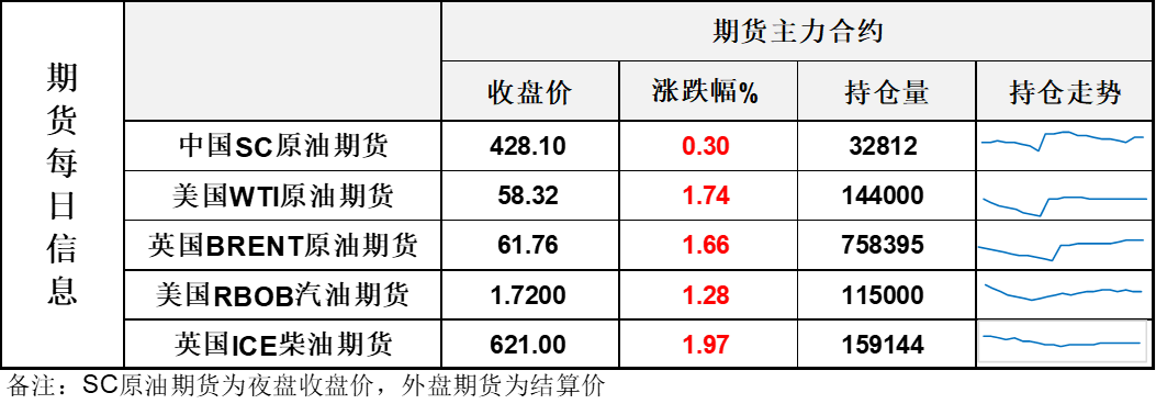 【1】WTI主力原油期货收涨1美元,涨幅1.74%,报58.32美元/桶;布伦特主力原油期货收涨1.01美元,涨幅1.66%,报61.76美元/桶;INE原油期货收涨0.3%,报428.1元。
