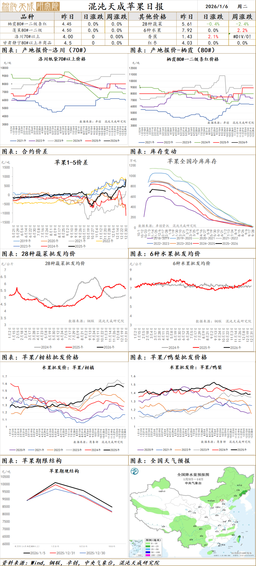 苹果:截至2025年12月31日,全国主产区苹果冷库库存量为733.56万吨,环比上周减少10.47万吨,去库速度低于去年同期;山东产区库存苹果晚熟纸袋富士主流价格稳定,冷库主要成交中小果及少量统货,其他品种货源电商需求较旺,春节备货开始,客户采购量增加,整体出货稍有提高;陕西产区主流价格稳定,贸易商多自己包装自有货源发市场,冷库客商成交增加,客商主要选购好货及低价货,好货难寻,包装自有货源的比较多;消费端表现偏弱,柑橘等水果大量上市,交割博弈再次发酵,2605合约放量大涨,维持高位震荡,近期主要关注春节备货消费端表现。