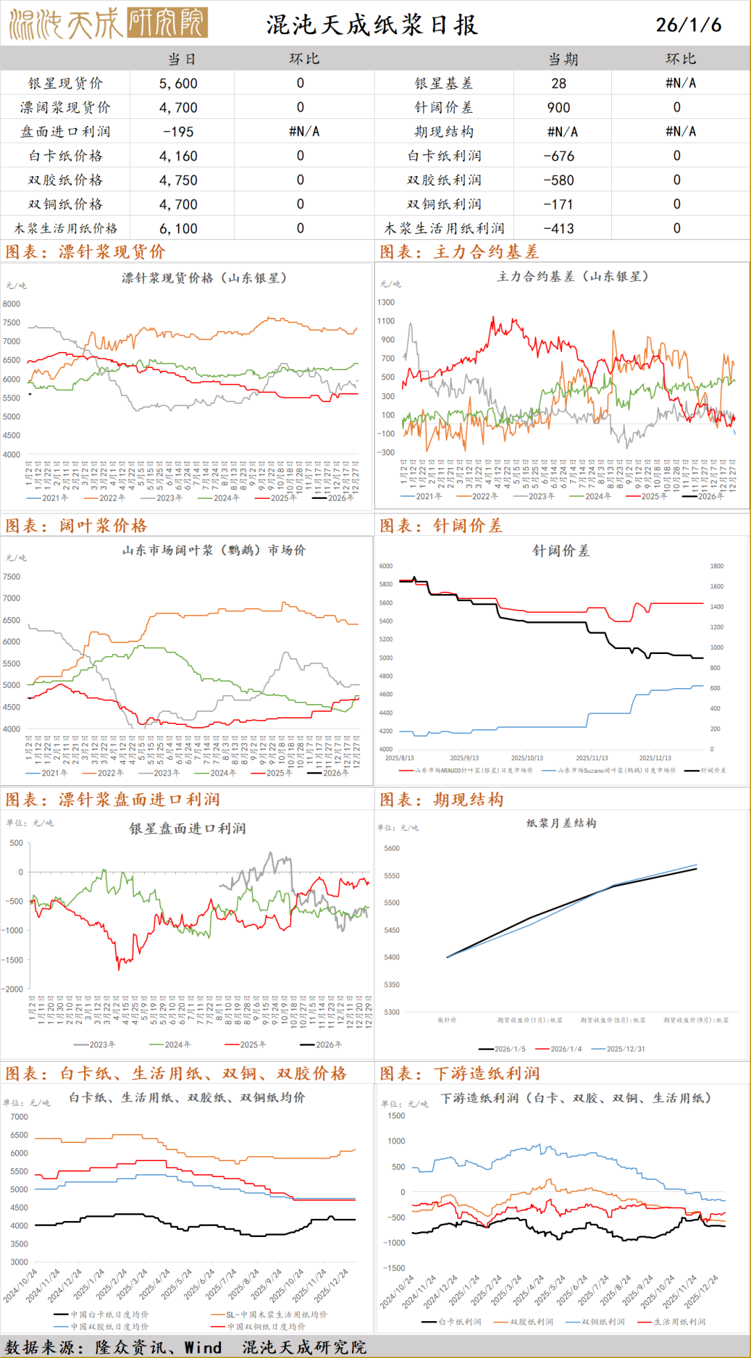纸浆:亚太森博表示,1月阔叶浆接单价格上调150元/吨;昨日国内针叶浆现货稳定,银星5600元/吨(0),俄针5400元/吨(0);阔叶浆现货稳定,金鱼4700元/吨(0);针阔叶浆价差900元/吨(0),纸浆市场整体呈现交投清淡、价格持稳;白卡纸市场行情维持平稳运行,局部有喊涨声音,市场业者保持观望态度;生活用纸市场价格震荡运行,市场整体交投活跃度变化不大,业者观望情绪较浓;文化用纸市场市场整体供应充足,工厂在成本支撑下维持挺价策略;盘面高位震荡,近年针叶浆整体产能扩张有限,持续低价导致上游高成本浆厂出现停产、关闭产能等情况,下成本支撑明显,同时交割品取消部分俄针品牌,对远月估值也有利多,国内纸厂整体维持刚需购买,在国内春节旺季结束前,可以考虑回调逢低买入。