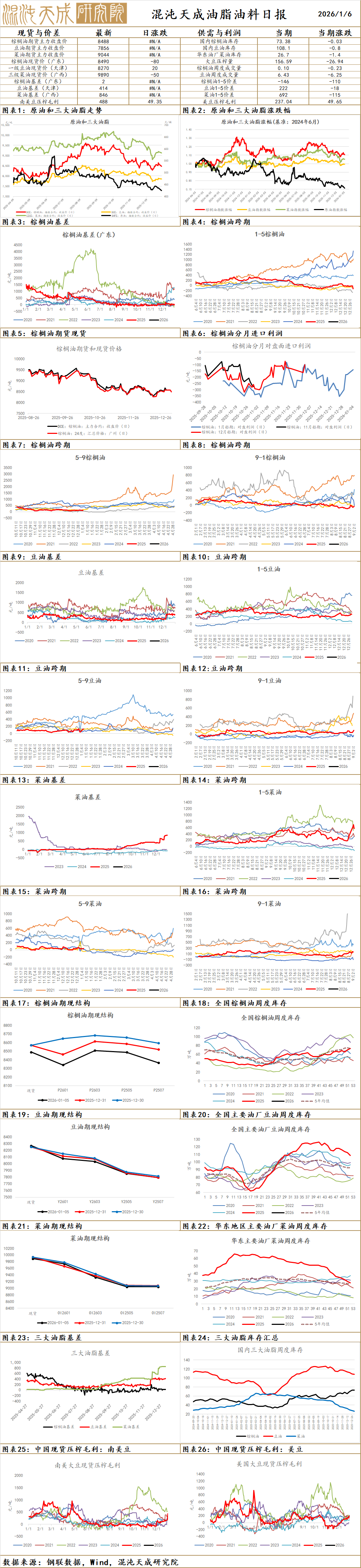 供给端:截至12月23日,阿根廷2025/26年度大豆播种完成75.5%,高于一周前的67.3%,大豆播种工作已进入最后阶段,已播种大豆的生长状况良好,全国95.2%的大豆评级正常到优良,高于一周前的93%;CONAB数据,截至12月20日,巴西大豆播种率为97.6%,上周为94.1%,去年同期为97.8%,五年均值为94.9%;巴西农业咨询机构AgRural表示,巴西2025/26年度大豆产量预计将达到1.804亿吨,较其11月预估的1.785亿吨有所上调;中国表示将恢复三家美国公司对华出口大豆的资格,中国已同意在未来三年内每年至少购买2500万吨大豆,本季购买1200万吨大豆;国家粮油信心中心预估2025年12月全国主要油厂大豆压榨量在905万吨左右,月环比增加5万吨,同比增加80万吨,较过去三年同期均值增加75万吨,2026年1月我国进口大豆到港量或继续下降、油厂开机率略有降低,预计全月国内主要油厂大豆压榨量在800万吨左右,同比增加约70万吨,较过去三年同期均值增加约90万吨。