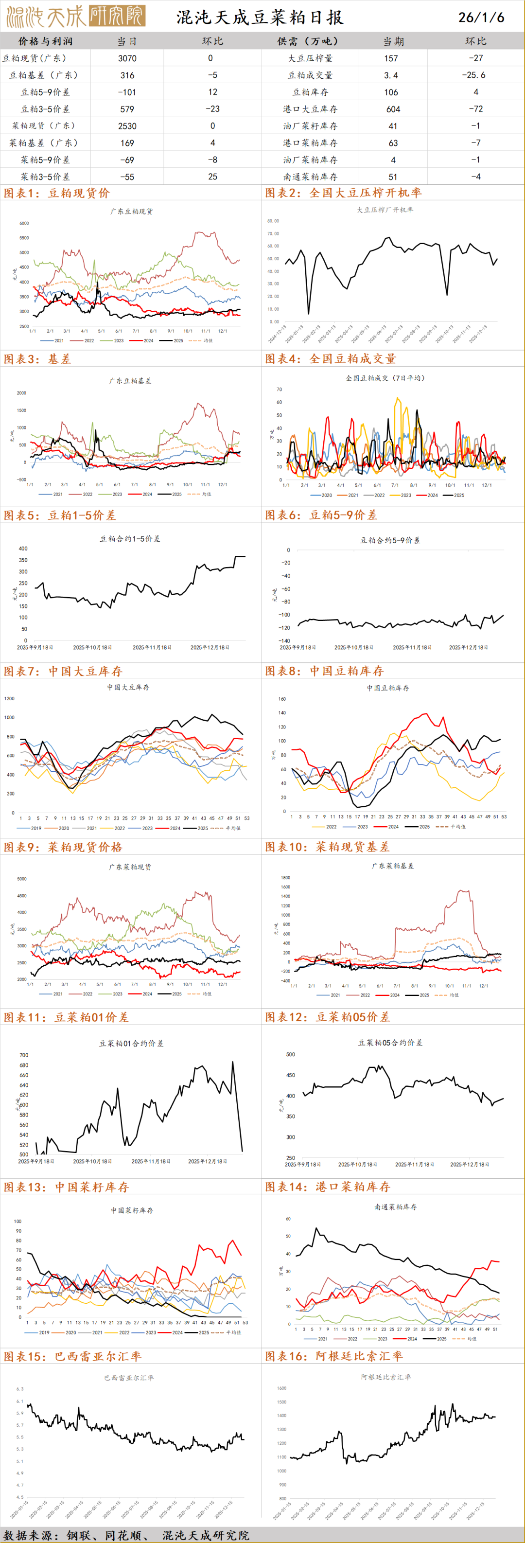 供需数据:上周元旦假期国内部分油厂停机,大豆压榨量减少。监测显示,截至2026年1月4日当周,国内主要油厂大豆压榨量175万吨,周环比下降31万吨,月环比下降30万吨,同比增加3万吨,较过去三年同期均值下降9万吨。预计本周油厂大豆压榨量在180万吨左右。
