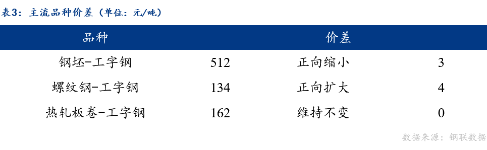今日钢坯与工字钢价差正向缩小,螺纹钢与工字钢价差正向扩大。