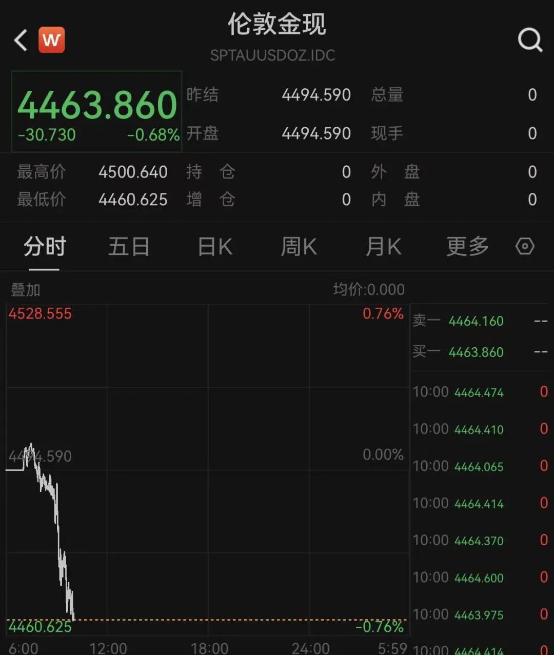 今日早间(1月7日),现货黄金、白银突然直线跳水,截至发稿,黄金跌至4463美元附近,今日一度涨至4500美元。白银更是下跌逾1%。