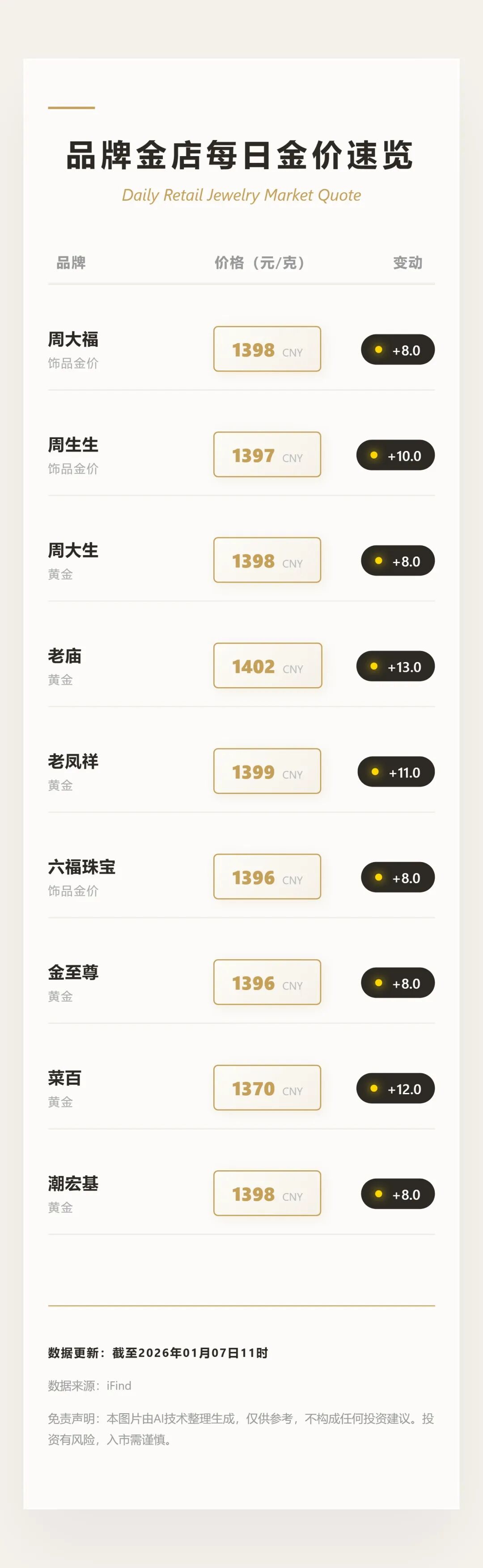 据同花顺(300033)iFinD数据,今日(1月7日)国内黄金饰品价格对比显示,黄金珠宝品牌公布的境内足金首饰价格较昨日集体上涨,最高报1402元/克。