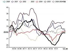 截至2025年12月29日,全国饲料企业平均库存天数达到29.92天,较前一周增加0.04天,环比上涨0.13%,同比下跌2.73%,库存天数偏低。