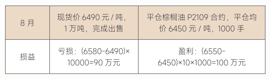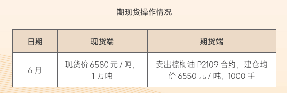 该企业通过期货买入套保,规避了棕榈油后期价格上涨的风险期货端盈利覆盖了现货端成本的上升,期现结合实现盈利。