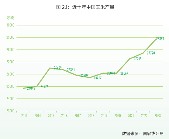 在生产方面,玉米是我国种植面积最大、产量最高的粮食作物。近年来,特别是2016 年临储政策取消后,玉米市场化程度明显提高加之种植技术日益提升,我国玉米产量总体呈上升态势(如图21所示)。根据国家粮油信息中心数据显示,23/24作物年度我国玉米种植面积达到 4.42 万公顷,产量 2.89 亿吨。
