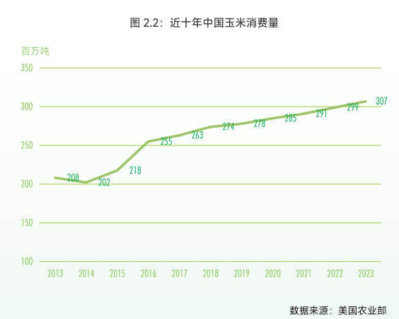 在消费方面,玉米主要用于饲用和工业消费,二者占玉米消费总量的 90%以上。近年来,随着下游养殖行业规模不断扩大,对以玉米为主要原料的饲料需求也在逐年增加,推动玉米消费量总体呈上升态势(如图 2.2 所示)。此外,从整体看,近年来国内玉米产不足需在饲用消费方面,国产玉米需求面临着稻谷、进口玉米、小麦、高粱大麦等其它谷物的替代。