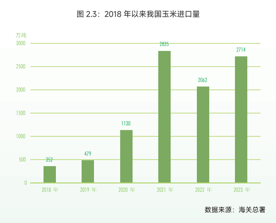 在进口方面,2020年以来,我国玉米进口量保持在高位(如图2.3所示),根据海关总署数据显示,2023 年我国进口玉米量达到 2714万吨,仅次于2021年的2835万吨,从进口来源看,主要从美国、巴西、乌克兰、俄罗斯等国。