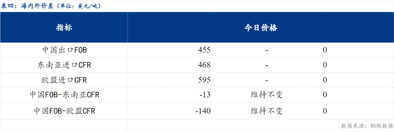 从区域价差来看,华东与东北价差90元/吨,较上一交易日正向扩大10元/吨 ;华东与华南价差0元/吨,较上一交易日正向缩小10元/吨 ;华南与华北价差90元/吨,较上一交易日持平。
