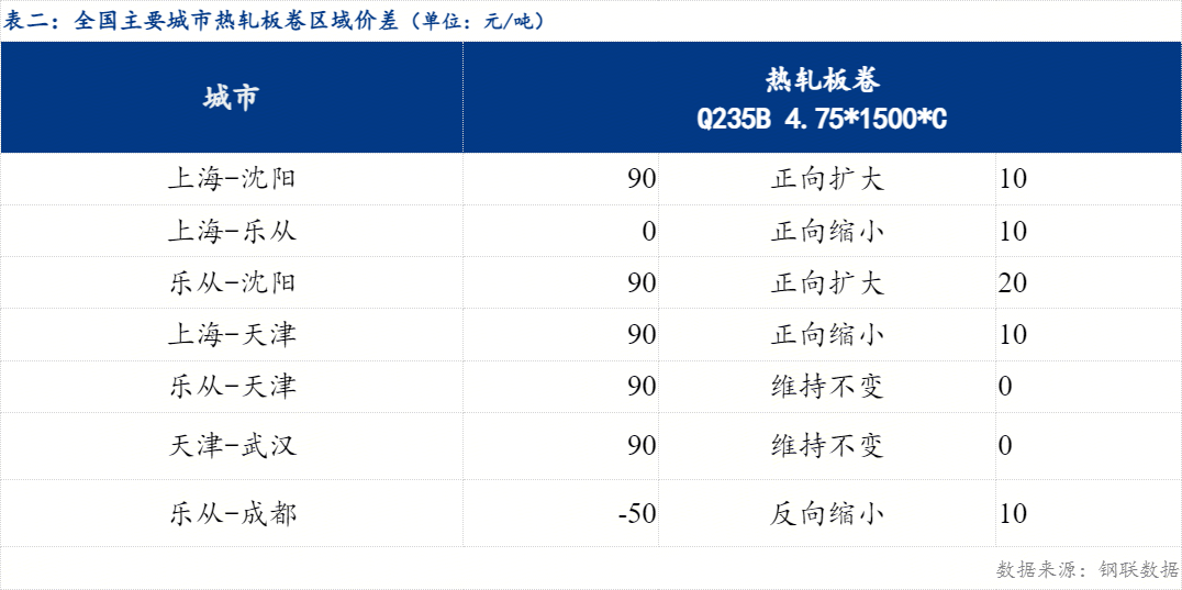 从品种价差来看,卷螺差较上一交易日反向缩小1元/吨,热中价差较上一交易日反向缩小17元/吨 ,热带价差较上一交易日正向缩小5元/吨 ,热冷价差较上一交易日反向缩小23元/吨。