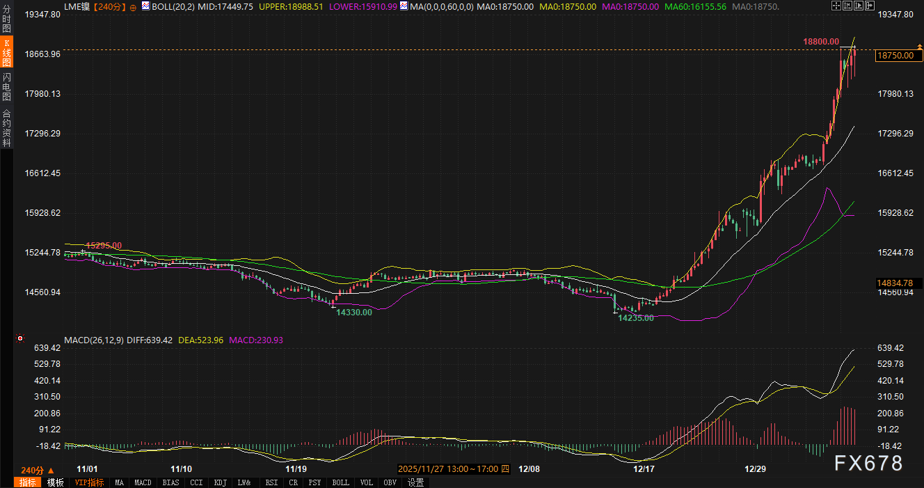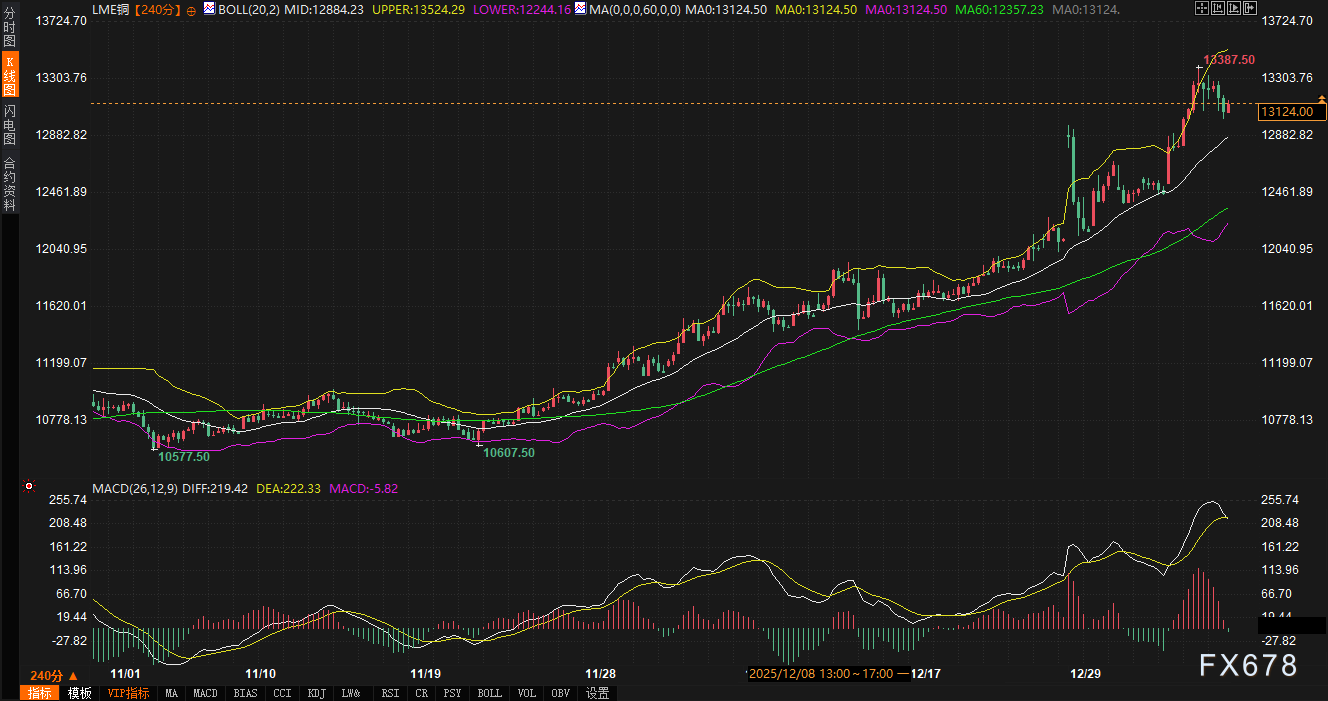LME三个月期铜盘中报每吨13144美元,日内下跌0.7%。就在前一日,该合约刚刚刷新了每吨13387.50美元的历史最高纪录。240分钟图显示,铜价目前位于13122美元附近,日内跌幅约1%。其技术指标显示,布林带(20,2)上轨位于13524.42,中轨位于12884.22,价格从靠近上轨的区域回落;MACD指标中DIFF线为219.50,DEA线为222.35,呈现高位粘合迹象。这表明,在连续快速上涨后,市场短期动能有所减弱,正进行技术性调整。一位知名机构分析师指出,基本金属价格在早盘走软,去年12月下旬以来推动该板块上涨的看涨势头正在暂歇。当前市场仍受到仓位调整和动能交易的极大驱动,同时供应链风险和美国的宏观政策不确定性持续存在。有分析师直指市场存在“害怕错过”的情绪,甚至是对铜的“狂热”,并认为这种状态不可持续。尽管如此,部分机构基于强劲的市场动能,已将一季度铜价目标上调至14000美元,但同时维持全年均价预测不变。