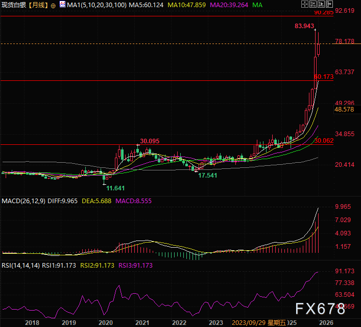 白银月线显示,白银突破30元之后就直奔60元,目前目标价是90元,60元作为月线级别的5日均线是非常坚实的底部区域。