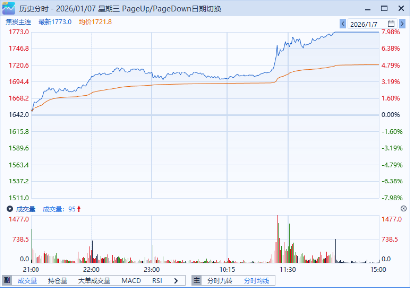 焦炭主力合约J2605当日以1,650元/吨开盘,开盘后迅速拉升,午后延续强势并触及涨停板1,773元/吨,终盘封死涨停。