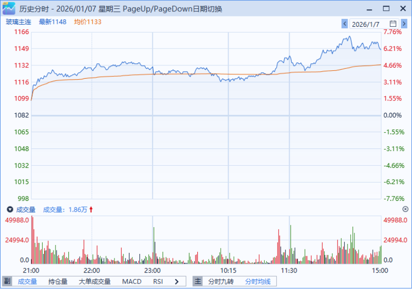 玻璃主力合约FG2605当日以1,097元/吨开盘,开盘后迅速拉升,盘中最高触及1,166元/吨,终盘收于1,148元/吨,较前一交易日上涨6.10%。