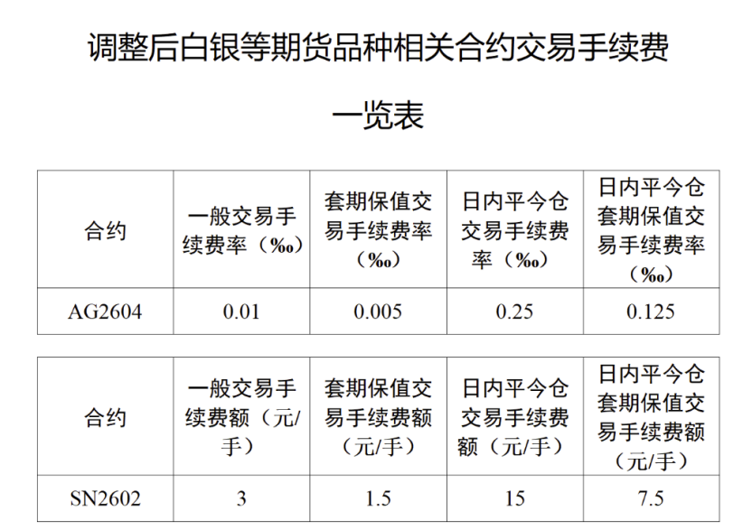 交易手续费方面,自2026年1月9日交易(即1月8日夜盘)起,白银期货AG2604合约日内平今仓交易手续费调整为成交金额的万分之二点五;沪锡期货SN2602合约日内平今仓交易手续费调整为15元/手。