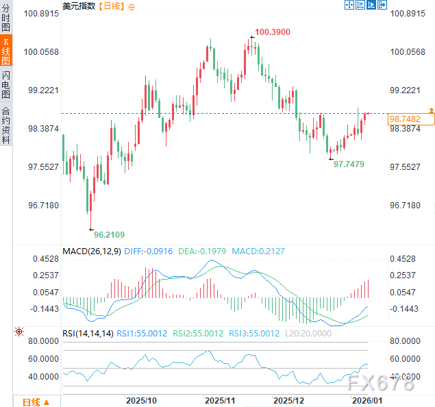 美元指数更可能继续在现有区间内震荡,周四(1月8日)亚市时段,美元指数于98.75附近窄幅震荡。