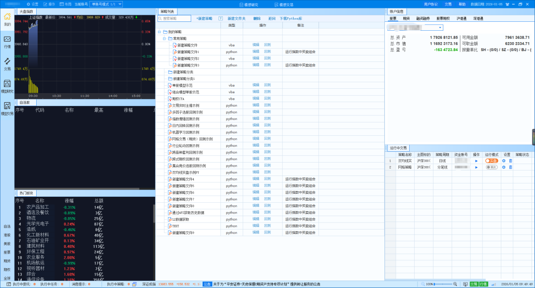 它集成了行情显示、策略研究、交易执行、风控管理四大核心功能,覆盖股票、两融、港股通、ETF 等多元交易品种,能将复杂的金融理论、数学模型转化为可落地的自动化交易策略。